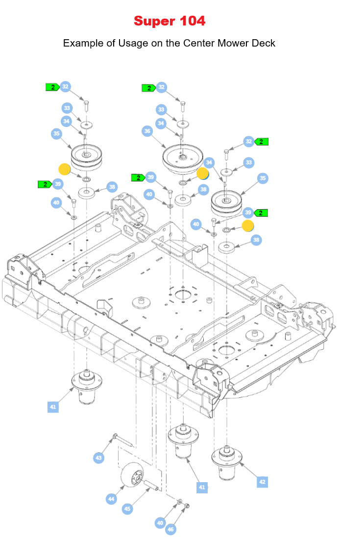 - 2011 - Current Super 104 Models * Used Only Under the Center Mower Deck Spindle's and on the Caster Wheel Assembly on the Two Wings.