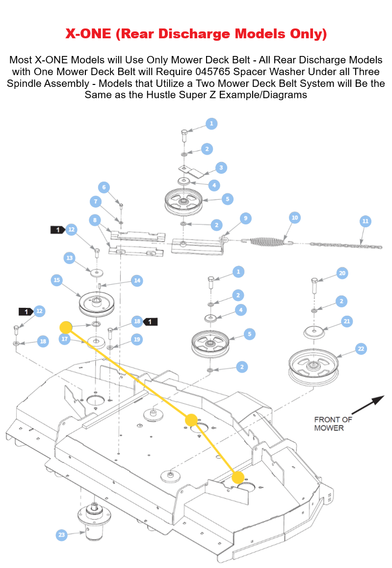- 2011 - Current X-ONE, Super Z, Super Z HD, Diesel Z (Rear Discharge Models Only). * Mower Deck Usages - Only Used under Standard Rotational Spindle Assemblies Pullies Which are Always Painted Black - Reverse or Left-Hand Rotational Spindles (Required only at Specific Mower Deck Locations and are Painted Red) are only on Rear Discharge Models and Will Require 3/8" Spacer 114108 in Place of 045765. Note Excludes Most X-ONE Models - Most X-ONE Models do not utilize Reverse Spindle Assemblies.