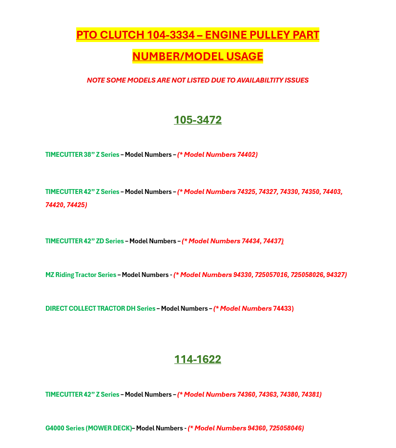 38”, 42” TIMECUTTER & MISC. RIDING TRACTORS - EARLY MODELS - 104-3334 MODEL/SERIES USAGE