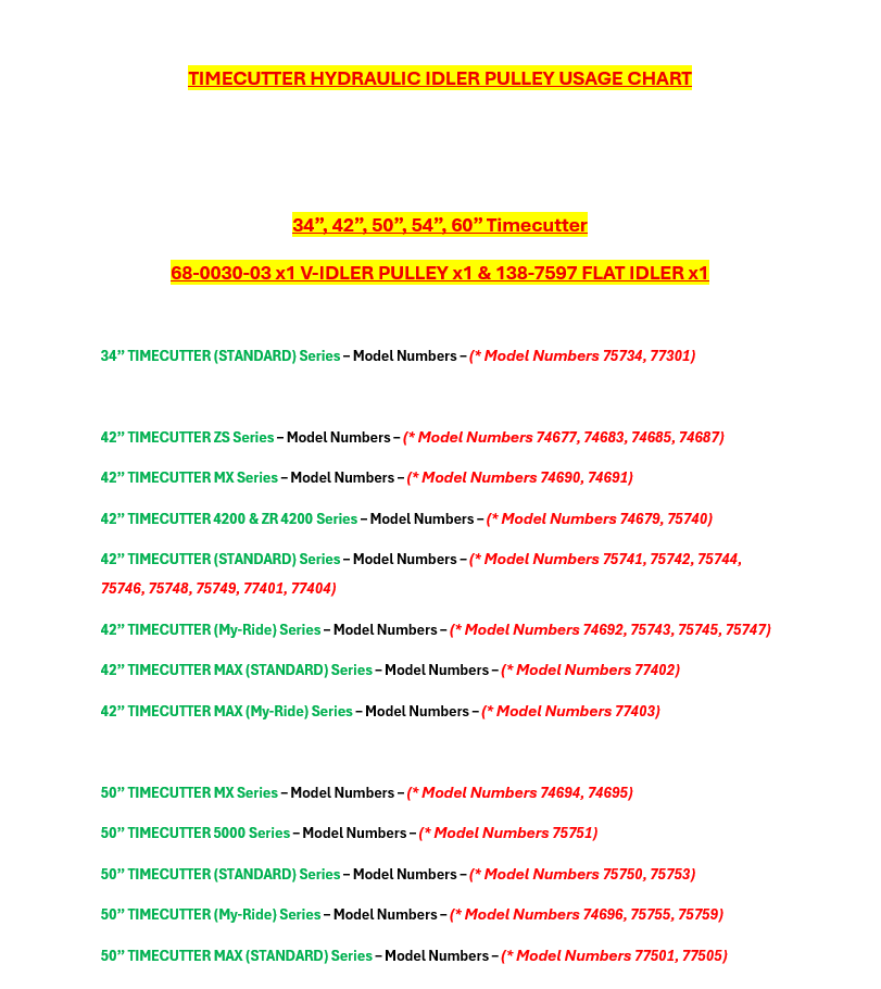 NOTE: Due to Serial Number and/or Model Design changes it is always Beneficial to Eliminate Confusion by Searching your Part Type and Model Number at the Top of our Website Page in the Search Tab. That in return will search the Model Fit Chart at the Bottom of the Page to Find the correct Model/Pulley Part Number Combo.