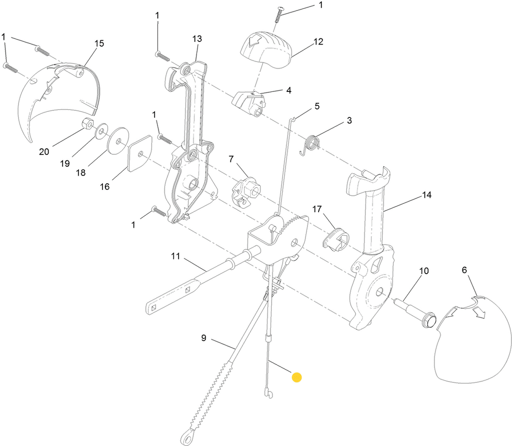 - NOTES & DETAILS: Toro OEM 105-9989 IS COMMINLY USED - 105-9989 Cable Ends - 105-9989 Chute Release Cable Attaches to the Chute Release Cable's QuickStick or Latch Lever 105-9988 that is Assembled inside the Handle or Quickstick assembly. The Lower End of the Chute Release Cable (With the Hook or Shoe) Attaches to the Quickstick Chute Latch 106-4476 (Latch is Responsible from Disabling the Discharge Chute to Rotation). - 105-9989 The Cable Itself - 105-9989 Chute Release Cable is Routed from the Chute Control Lever or Quistick Assembly Across the Discharge Chute Rod 106-7283 and Fastened to the Chute Control Rod with the Factory Installed Cable Clamp By Using the Bolt Whole on the Chute Control Rod and Carriage Bolt 3229-30 and Nylon Lock Nut 3296-73 - Next the Cable Continues Its Route Directly to and Insert Into the Cable Anchor on the Chute Gear Mount 106-7257 and Retained Using the Anchor Screw Washer Assembly 46-6810. - 105-9989 Deflector Cable Assembly - Enables the Operator to Push on the Blue Lever/Button on the Control Handle or Quick stick, By Pushing the Button/Lever the Cable Pulls the Toothed Latch Away from the Discharge Chute Gear Allowing the Discharge Chute to Rotate Left to Right as the Operator Rotate the Quickstick Left to Right. Click on the Associated Part Numbers to Be Redirected.