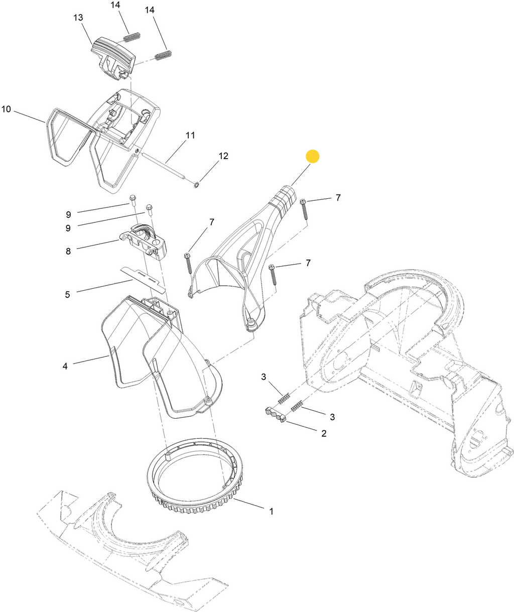 - 108-4922 – Detent Chute Ring (Assembled Between two Retaining Chute Retainers, Contains Gear for the QZE Features, Retain the Discharge Chute Via 114-3751 Fasteners and is Able to Rotate)