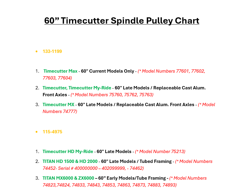NOTE: To Gain a better understanding of part number variations for Timecutter & TITAN Models Refer to the 54" Spindle Pulley Chart and the 48", 52", 54", 60" TITAN Spindle Pulley Chart below. The chart also includes Models/Series not listed within the Timecutter & TITAN Model/Series to clarify their corresponding part numbers.