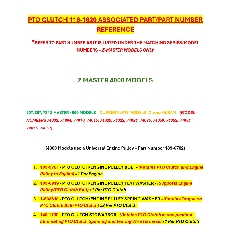 Toro OEM 116 1620 PTO Clutch is known for its precision engineering, durability, and reliable performance. Designed to Allow the correct Torque, Delay and Engagement Optimal for Engine and Mower Deck Components for Performance and Durability with the Push or Pull of a PTO switch. Enabling High-Quality Electronic Control over Mower Deck and Attachments, Toro 116 1620 PTO Clutch is Designed for Toro Current/Late 52", 60", 72" ZMaster 4000 Models - Current/Late/Early 48", 52", 60" ZMaster 3000, 5000, 6000 Models. Hilly Ridge does not offer any Type of Return on Electrical Items Unless it was an Error in Our Listings. So, Due to Variation Within Model Numbers/Series, Refer to the Model Fit Chart for an Accurate Break down of Specific Model Number Usage. Please refer to the Images above; Product Specifications and the Model Fit guide below to ensure proper fit. *Refer to the Engine Pulley and Associated Part Chart Below for Reference for Appropriate PTO Clutch Fastner Parts and Pulleys Associated to Segregated Models/Series Associated to PTO Clutch 116-1620. Part Numbers 116-1604 and 109-9282 Supersede to Part Number 116-1620.