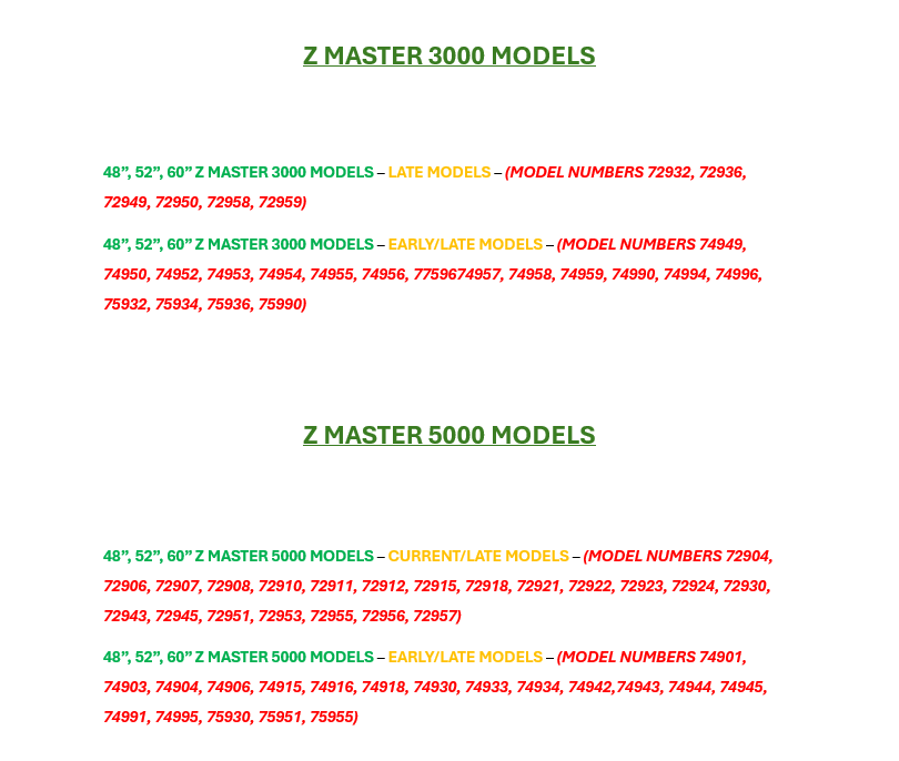 · Z MASTER 5000 MODELS – EARLY/LATE MODELS – (MODEL NUMBERS 74901, 74903, 74904, 74906, 74915, 74916, 74918, 74930, 74933, 74934, 74942,74943, 74944, 74945, 74991, 74995, 75930, 75951, 75955)