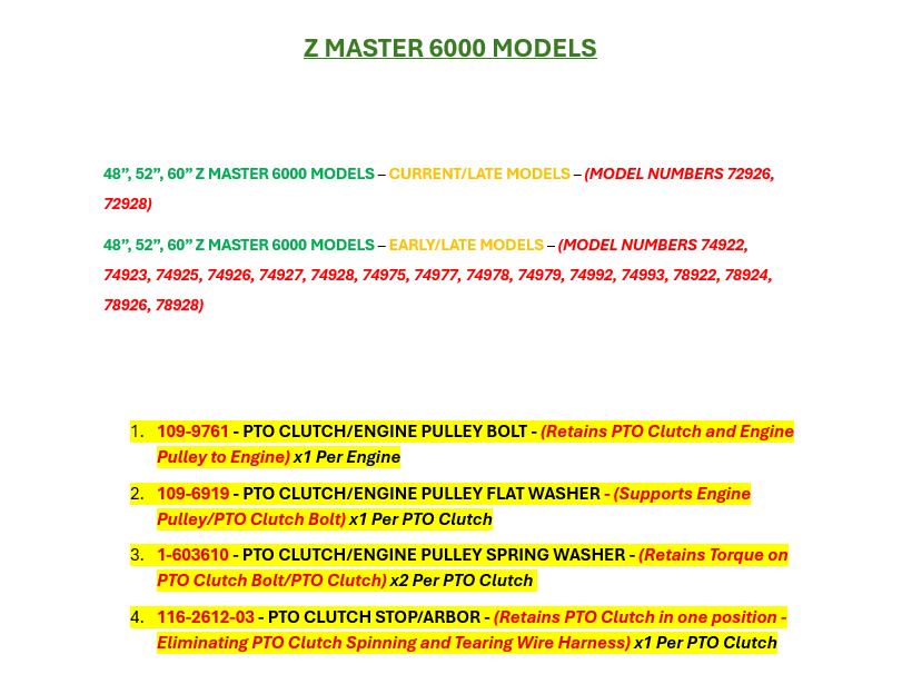 · Z MASTER 6000 MODELS – EARLY/LATE MODELS – (MODEL NUMBERS 74922, 74923, 74925, 74926, 74927, 74928, 74975, 74977, 74978, 74979, 74992, 74993, 78922, 78924, 78926, 78928)