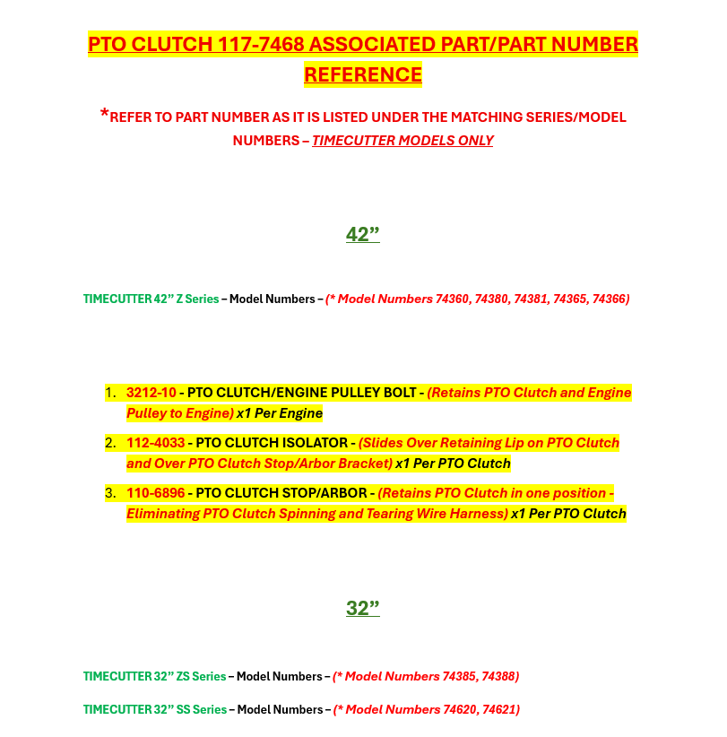 Toro OEM 117 7468 PTO Clutch is known for its precision engineering, durability, and reliable performance. Designed to Allow the correct Torque, Delay and Engagement Optimal for Engine and Mower Deck Components for Performance and Durability with the Push or Pull of a PTO switch. Enabling High-Quality Electronic Control over Mower Deck and Attachments, Toro 117 7468 PTO Clutch is Designed for Toro Late 32" Timecutter MX & Standard Models - Current/Late 34" Timecutter MX & Standard Models - Current/Late 42" Timecutter MX, SS, SW, SWX, Z, ZS, 4200, ZR4200, Standard, My-Ride Models - Early XLS Riding Tractor Models. Hilly Ridge does not offer any Type of Return on Electrical Items Unless it was an Error in Our Listings. So, Due to Variation Within Model Numbers/Series, Refer to the Model Fit Chart for an Accurate Break down of Specific Model Number Usage. Please refer to the Images above; Product Specifications and the Model Fit guide below to ensure proper fit. *Refer to the Engine Pulley and Associated Part Chart Below the Model Fit Chart for Reference for Appropriate PTO Clutch Fastner Parts and Pulleys Associated to Segregated Models/Series Associated to PTO Clutch 117-7468.