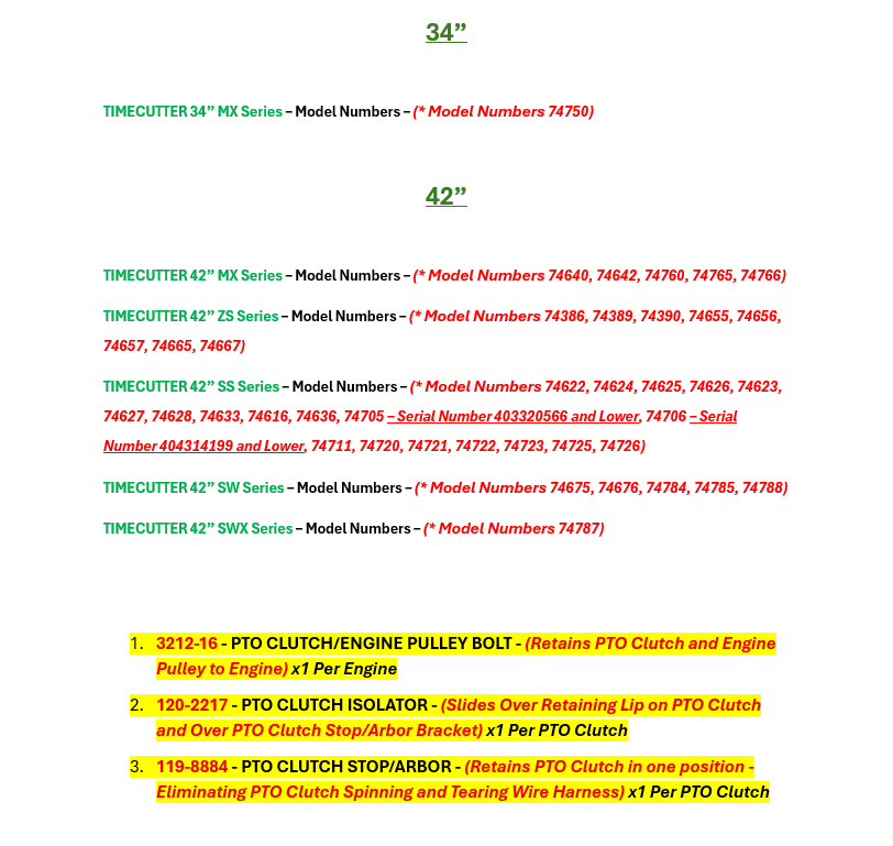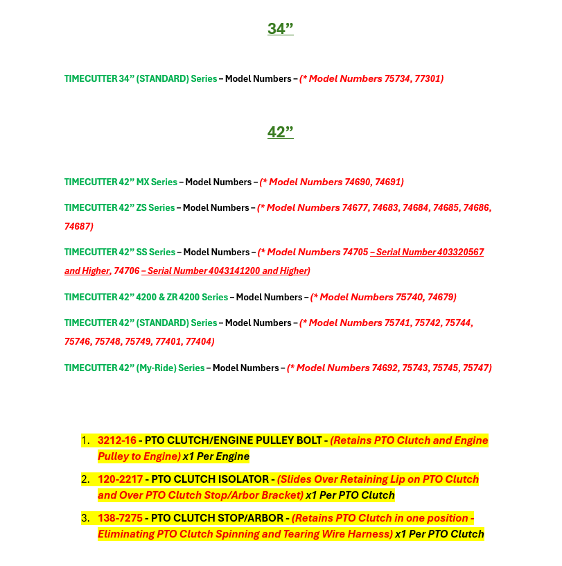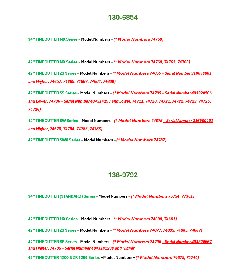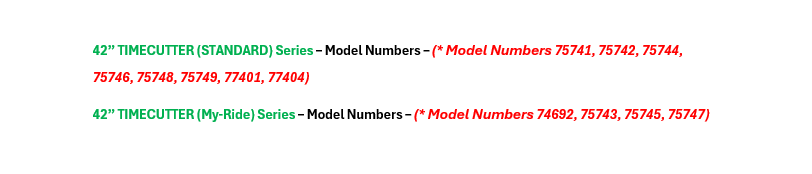 42” TIMECUTTER (My-Ride) Series – Model Numbers – (* Model Numbers 74692, 75743, 75745, 75747)