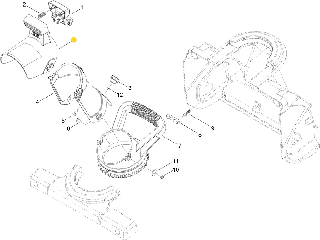 - Transfer or Assemble: The spring/trigger parts to the new deflector as needed - All Components are Clip Together Including the Chute Deflector to Discharge Chute (common: 136-7136 compression spring, 117-2314 trigger).