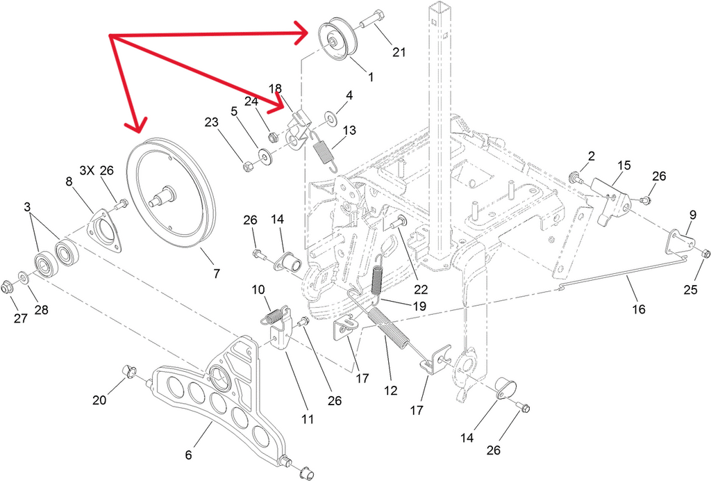 - 3-4244 - IDLER PULLEY (Contains Roller Bearing that Allow the Pulley to Match the Speed of the Engine RPM's and is Retained to the Idler Pulley Tensioner Arm - Used to Retain Constant Pressure on The Traction Drive Belt via an Extension Spring Allowing the Rotation of the Traction Pulley to remain Constant) x1 Per Snowblower Unit