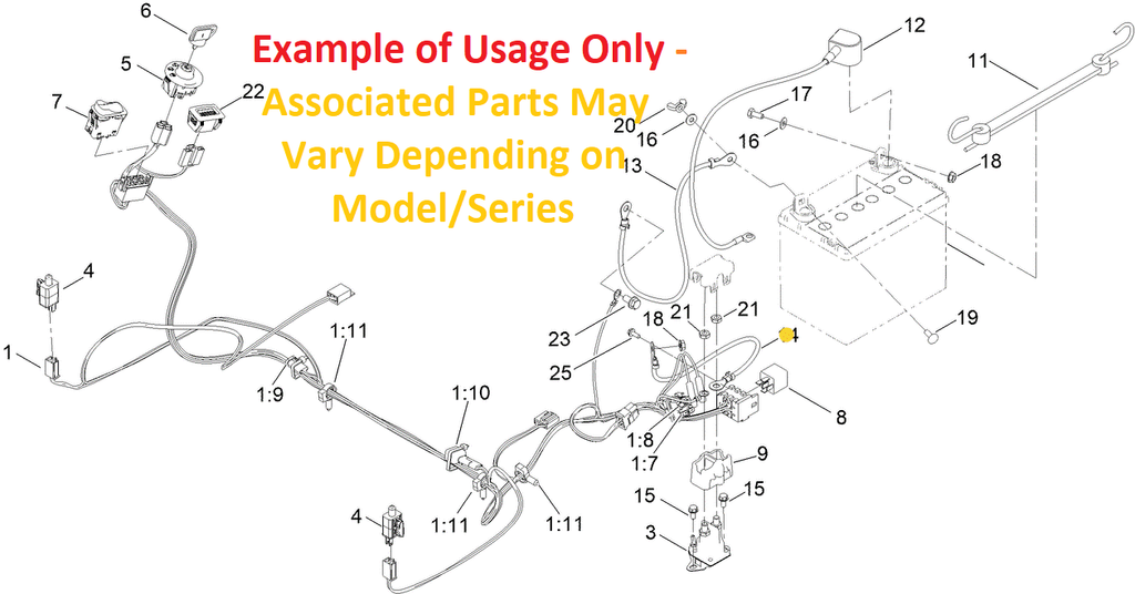 - NOTES & DETAILS: Toro OEM 121-0711 Red Positive Battery Cable is Primarily Used Between the Electrical Solenoid and the Engine's Starter Assembly. 121 0711 Main Purpose is Service by Transferring Electrical Current from the Solenoid to the Engine's Electric Starter under the Direction and Functions of the Ignition Switch and Electric Solenoid. 121 0711 Also Contains the Correct Size Battery Wire End Eyelets Needed for the Require Fasteners.