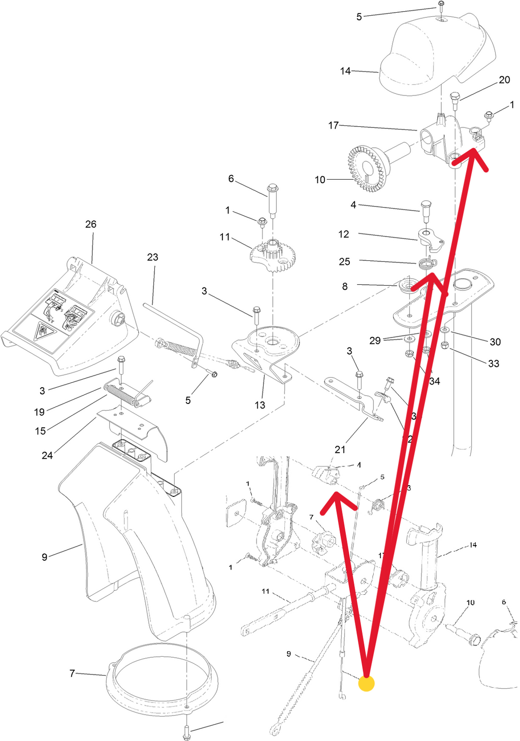 - NOTES & DETAILS: Toro OEM 125-1113 IS COMMINLY USED - 125-1113 Cable Ends - 125-1113 Chute Release Cable Attaches to the Chute Release Cable's QuickStick or Latch Lever 105-9988 that is Assembled inside the Handle or Quickstick assembly. The Lower End of the Chute Release Cable (With the Hook or Shoe) Attaches to the Quickstick Chute Latch 106-4476 (Latch is Responsible from Disabling the Discharge Chute to Rotation). - 125-1113 The Cable Itself - 125-1113 Chute Release Cable is Routed from the Chute Control Lever or Quistick Assembly Across the Discharge Chute Rod 106-7283 and Fastened to the Chute Control Rod with the Factory Installed Cable Clamp By Using the Bolt Whole on the Chute Control Rod and Carriage Bolt 137-3056 and Nylon Lock Nut 137-3094 - Next the Cable Continues Its Route Directly to and Insert Into the Cable Anchor on the Chute Gear Mount 106-7257 and Retained Using the Anchor Screw Washer Assembly 46-6810. - 125-1113 Deflector Cable Assembly - Enables the Operator to Push on the Blue Lever/Button on the Control Handle or Quick stick, By Pushing the Button/Lever the Cable Pulls the Toothed Latch Away from the Discharge Chute Gear Allowing the Discharge Chute to Rotate Left to Right as the Operator Rotate the Quickstick Left to Right. Click on the Associated Part Numbers to Be Redirected.