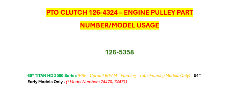 Toro OEM 126 4324 PTO Clutch is known for its precision engineering, durability, and reliable performance. Designed to Allow the correct Torque, Delay and Engagement Optimal for Engine and Mower Deck Components for Performance and Durability with the Push or Pull of a PTO switch. Enabling High-Quality Electronic Control over Mower Deck and Attachments, Toro 126 4326 PTO Clutch is Designed for Toro Late 60" TITAN HD 2500 Models (Tube Style Framing). Hilly Ridge does not offer any Type of Return on Electrical Items Unless it was an Error in Our Listings. So, Due to Variation Within Model Numbers/Series, Refer to the Model Fit Chart for an Accurate Break down of Specific Model Number Usage. Please refer to the Images above; Product Specifications and the Model Fit guide below to ensure proper fit.