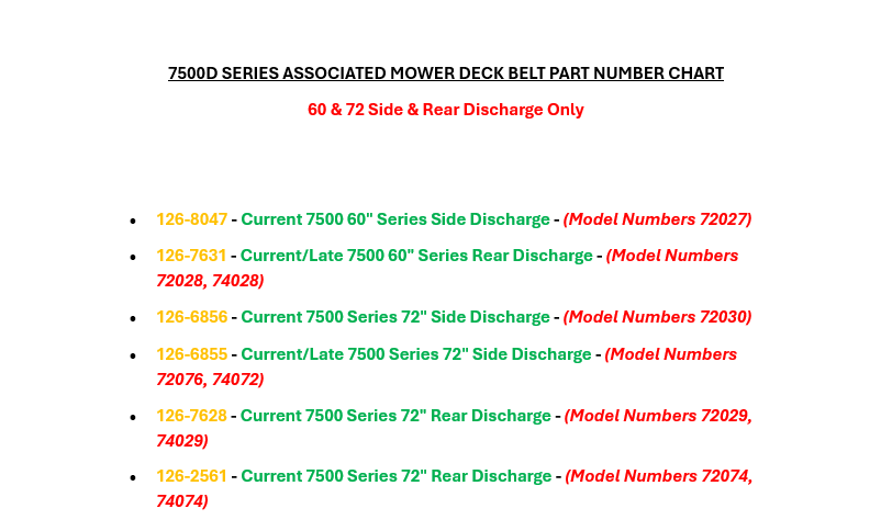 NOTE 1: Due to Serial Number and/or Model Design changes it is always Beneficial to Eliminate Confusion by Searching your Belt Type and Model Number at the Top of our Website Page in the Search Tab. That in return will search the Model Fit Chart at the Bottom of the Page to Find the correct Model/Belt Part Number Combo. Second Method is to refer to the Images and the Notes in the Image Section of Some of the more Common Model Differences as well as refer to the Part Numbers under the Mower Deck Belt Associated Part Number Reference Chart and Visually Match the correct Part Number with the Correct Model Combo. If this does not prove helpful and you still need assistance with finding the correct part number feel free to text us, email or give us a call and we can try to help you. Remember if further assistance is needed you will need to provide Models and Serial Number of the Unit you are wishing to receive Help with.