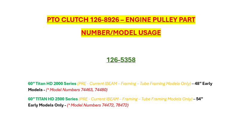 Toro OEM 126 8926 PTO Clutch is known for its precision engineering, durability, and reliable performance. Designed to Allow the correct Torque, Delay and Engagement Optimal for Engine and Mower Deck Components for Performance and Durability with the Push or Pull of a PTO switch. Enabling High-Quality Electronic Control over Mower Deck and Attachments, Toro 126 8926 PTO Clutch is Designed for Toro Late 60" TITAN HD 2000 & TITAN HD 2500 Models (Tube Style Framing). Hilly Ridge does not offer any Type of Return on Electrical Items Unless it was an Error in Our Listings. So, Due to Variation Within Model Numbers/Series, Refer to the Model Fit Chart for an Accurate Break down of Specific Model Number Usage. Please refer to the Images above; Product Specifications and the Model Fit guide below to ensure proper fit.