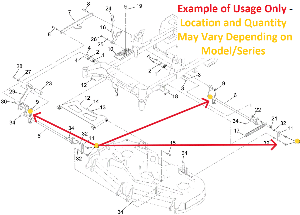 - APPLICATIONS: 130 0742 is used in Select Vac & Collection System or Kit BUT IS PRIMARILY Used in Mower Deck Lift Linkage to Fasten the Lift Link or Lift Link Chain to Mower Deck and in Some Models and Series to the Mower Deck Pivot Lift/Leverage Arm/Shaft as well - In some Model 130-0742 is also used to Fasten the Mower Deck Pivot Pan to the Frame and in Some Case to the Mower Deck as well Depending on Model/Series.