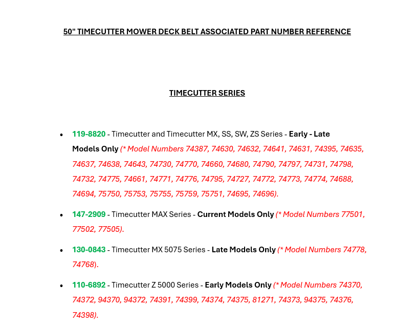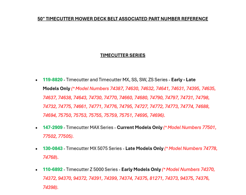 NOTE 1: Due to Serial Number and/or Model Design changes it is always Beneficial to Eliminate Confusion by Searching your Belt Type and Model Number at the Top of our Website Page in the Search Tab. That in return will search the Model Fit Chart at the Bottom of the Page to Find the correct Model/Belt Part Number Combo. Second Method is to refer to the Images and the Notes in the Image Section of Some of the more Common Model Differences as well as refer to the Part Numbers under the Mower Deck Belt Associated Part Number Reference Chart and Visually Match the correct Part Number with the Correct Model Combo. If this does not prove helpful and you still need assistance with finding the correct part number feel free to text us, email or give us a call and we can try to help you. Remember if further assistance is needed you will need to provide Models and Serial Number of the Unit you are wishing to receive Help with.