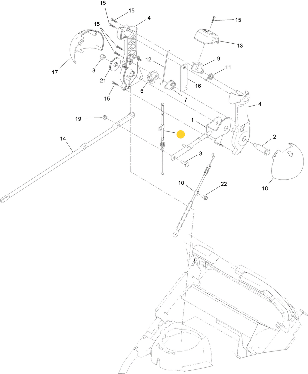 - NOTES & DETAILS: Toro OEM 130-9614 IS COMMINLY USED - 130-9614 Cable Ends - 130-9614 Chute Release Cable Attaches to the Chute Release Cable's QuickStick or Latch Lever 105-9988 that is Assembled inside the Handle or Quickstick assembly. The Lower End of the Chute Release Cable (With the Plastic Insert Clips) Attaches to the Quickstick Chute Latch 130-9607 (Latch is Responsible from Disabling the Discharge Chute to Rotation). - 130-9614 The Cable Itself - 130-9614 Chute Release Cable is Routed from the Chute Control Lever or Quistick Assembly Across the Discharge Chute Rod 144-1236 and Fastened to the Chute Control Rod with the Factory Installed Cable Clamp By Using the Spare Bolt Whole on the Chute Control Rod and Carriage Bolt 137-3056 and Nylon Lock Nut 137-3094 - Next the Cable Continues Its Route Directly to and Insert Into the Chute Gear Mount 130-9608 Using The Factory Molded Retaining Tabs on the Chute Release Cable. - 130-9614 Deflector Cable Assembly - Enable the Operator to Push on the Blue Lever/Button on the Control Handle or Quick stick, By Pushing the Button/Lever the Cable Pulls the Toothed Latch Away from the Discharge Chute Gear Allowing the Discharge Chute to Rotate Left to Right as the Operator Rotate the Quickstick Left to Right. Click on the Associated Part Numbers to Be Redirected.