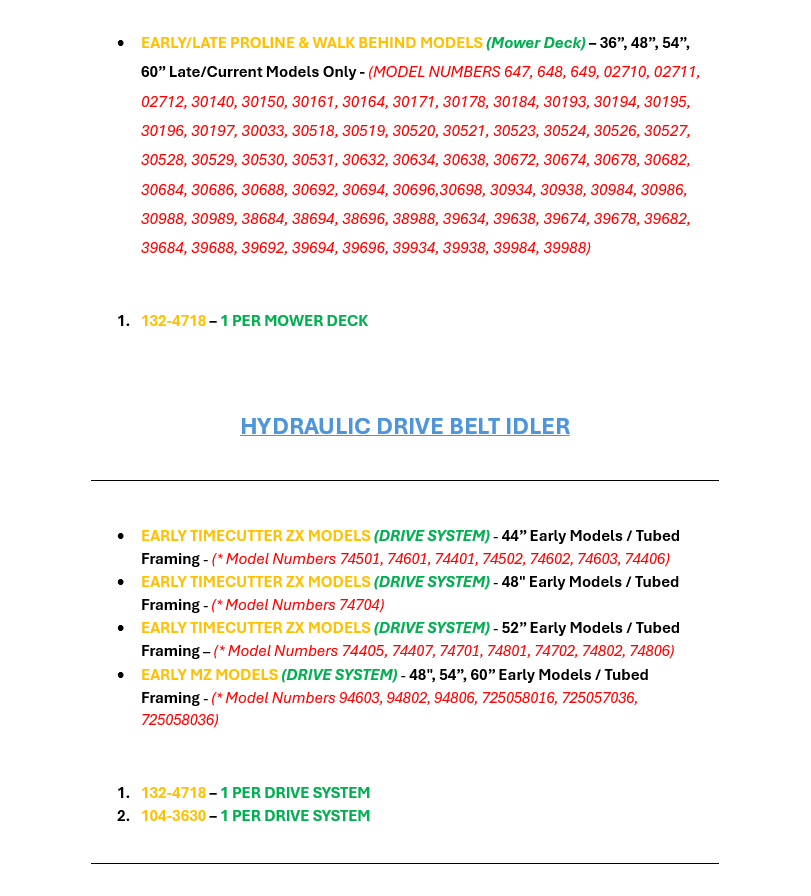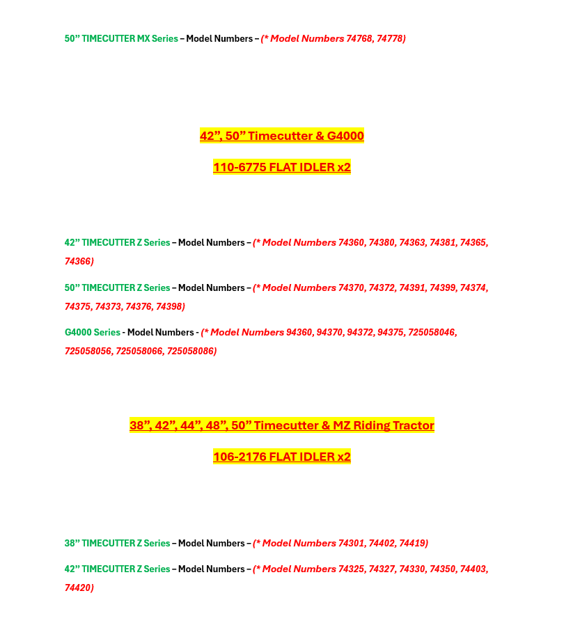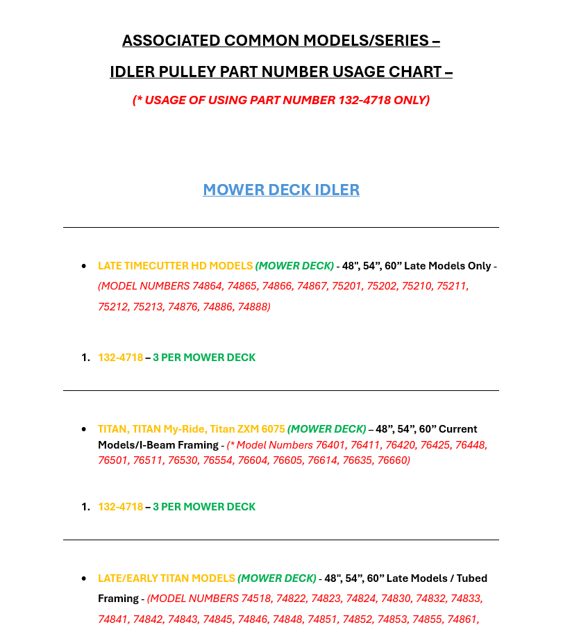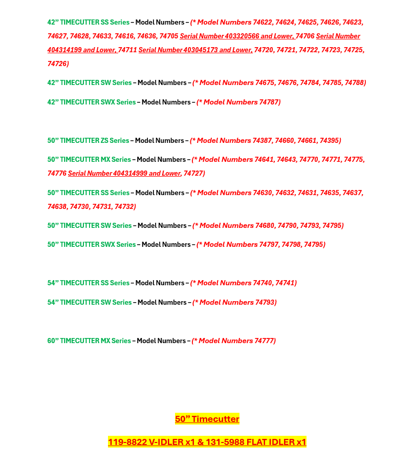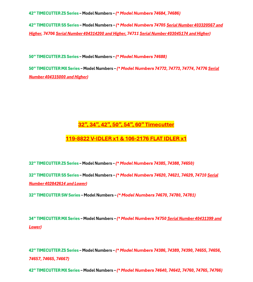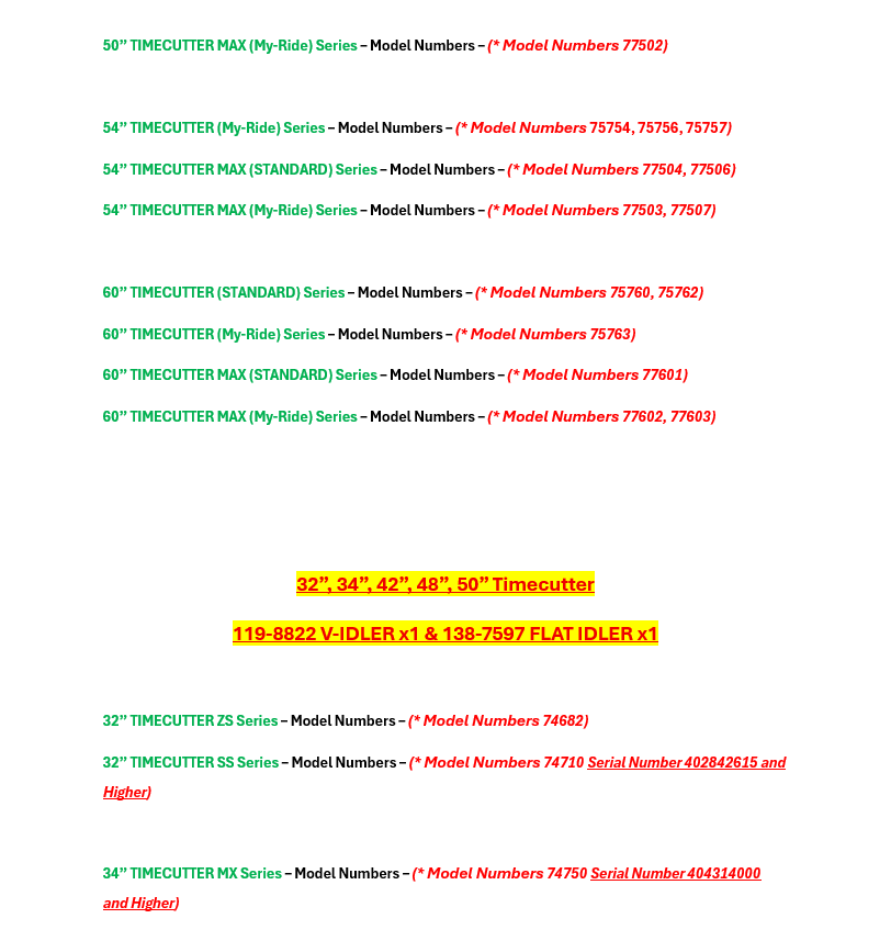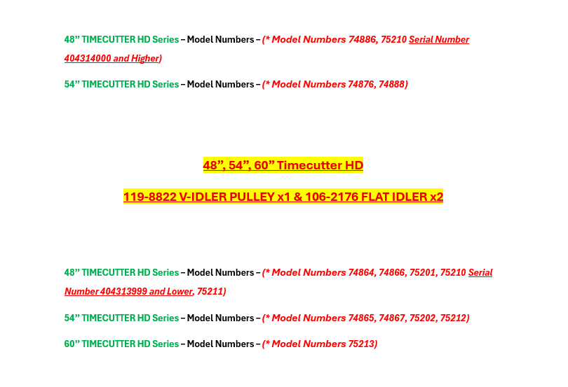· LATE TIMECUTTER HD MODELS (MOWER DECK) - 48", 54”, 60” Late Models Only - (MODEL NUMBERS 74864, 74865, 74866, 74867, 75201, 75202, 75210, 75211, 75212, 75213, 74876, 74886, 74888)