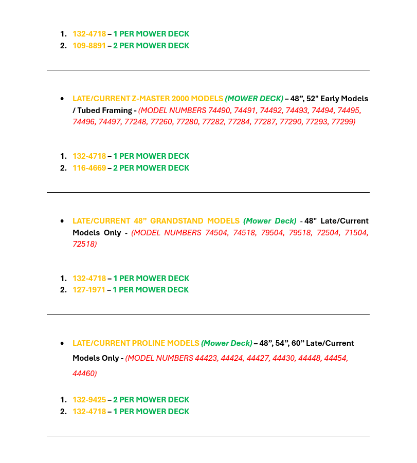 · LATE/CURRENT Z-MASTER 2000 MODELS (MOWER DECK) – 48”, 52" Early Models / Tubed Framing - (MODEL NUMBERS 74490, 74491, 74492, 74493, 74494, 74495, 74496, 74497, 77248, 77260, 77280, 77282, 77284, 77287, 77290, 77293, 77299)