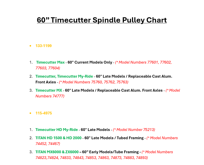 NOTE: To Gain a better understanding of part number variations for Timecutter Models Refer to the 60" Spindle Pulley Chart below. The chart also includes Models/Series not listed within the Timecutter Model/Series to clarify their corresponding part numbers.