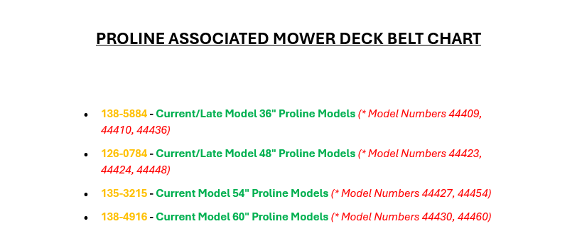 NOTE 1: Due to Serial Number and/or Model Design changes it is always Beneficial to Eliminate Confusion by Searching your Belt Type and Model Number at the Top of our Website Page in the Search Tab. That in return will search the Model Fit Chart at the Bottom of the Page to Find the correct Model/Belt Part Number Combo. Second Method is to refer to the Images and the Notes in the Image Section of Some of the more Common Model Differences as well as refer to the Part Numbers under the Mower Deck Belt Associated Part Number Reference Chart and Visually Match the correct Part Number with the Correct Model Combo. If this does not prove helpful and you still need assistance with finding the correct part number feel free to text us, email or give us a call and we can try to help you. Remember if further assistance is needed you will need to provide Models and Serial Number of the Unit you are wishing to receive Help with.