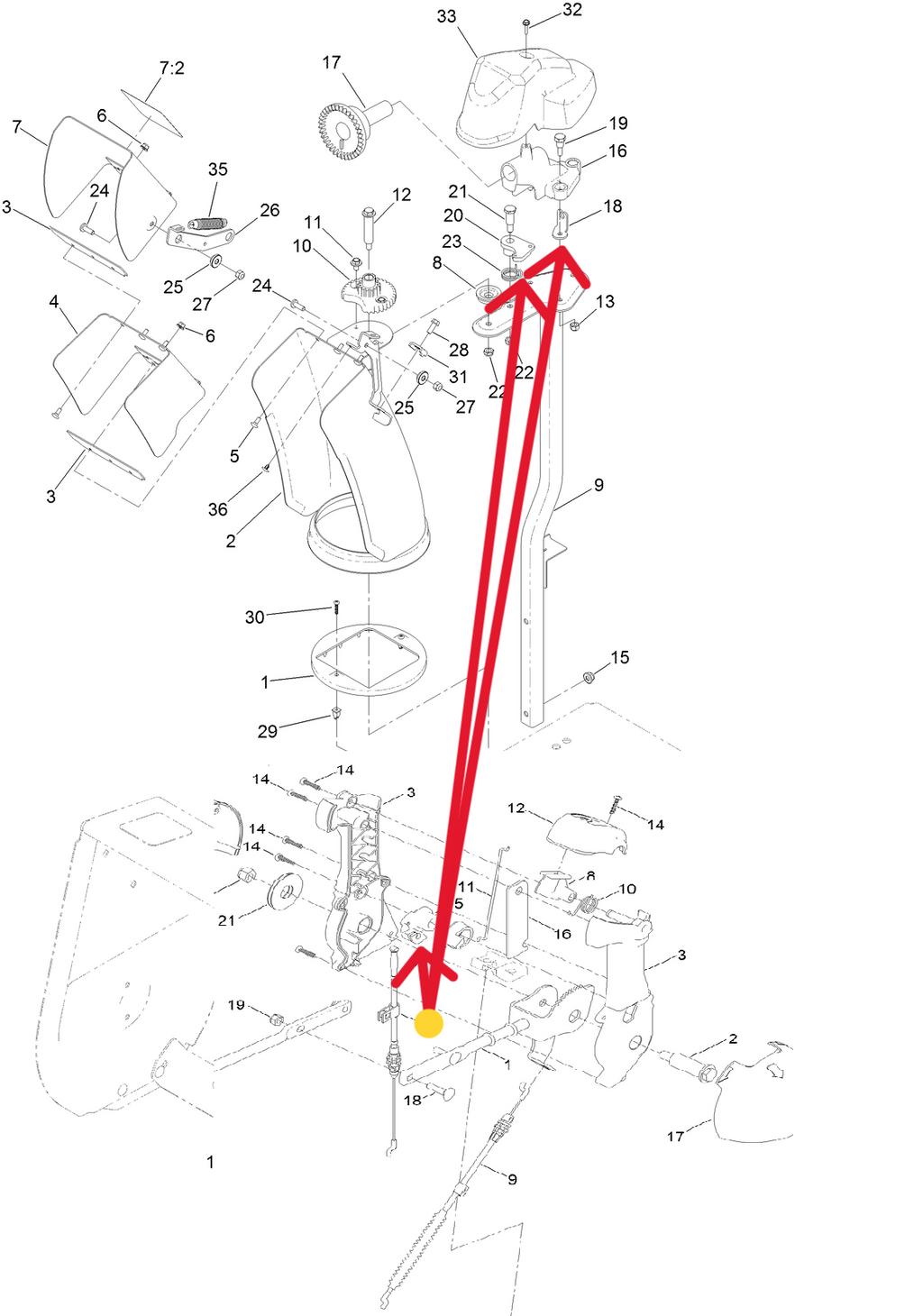 - NOTES & DETAILS: Toro OEM 136-6671 IS COMMINLY USED - 136-6671 Cable Ends - 136-6671 Chute Release Cable Attaches to the Chute Release Cable's QuickStick or Latch Lever 105-9988 that is Assembled inside the Handle or Quickstick assembly. The Lower End of the Chute Release Cable (With the Plastic Insert Clips) Attaches to the Quickstick Chute Latch 136-6525 (Latch is Responsible from Disabling the Discharge Chute to Rotation). - 136-6671 The Cable Itself - 136-6671 Chute Release Cable is Routed from the Chute Control Lever or Quistick Assembly Across the Discharge Chute Rod 136-6578 and Fastened to the Chute Control Rod with the Factory Installed Cable Clamp By Using the Spare Bolt Whole on the Chute Control Rod and Carriage Bolt 137-3056 and Nylon Lock Nut 137-3094 - Next the Cable Continues Its Routed Directly to and Insert Into the Cable Anchor 136-6676 that Is installed on the Chute Gear Mount 136-6517 Using The Factory Molded Retaining Tabs on the Chute Release Cable. - 136-6671 Deflector Cable Assembly - Enables the Operator to Push on the Blue Lever/Button on the Control Handle or Quick stick, By Pushing the Button/Lever the Cable Pulls the Toothed Latch Away from the Discharge Chute Gear Allowing the Discharge Chute to Rotate Left to Right as the Operator Rotate the Quickstick Left to Right. Click on the Associated Part Numbers to Be Redirected.