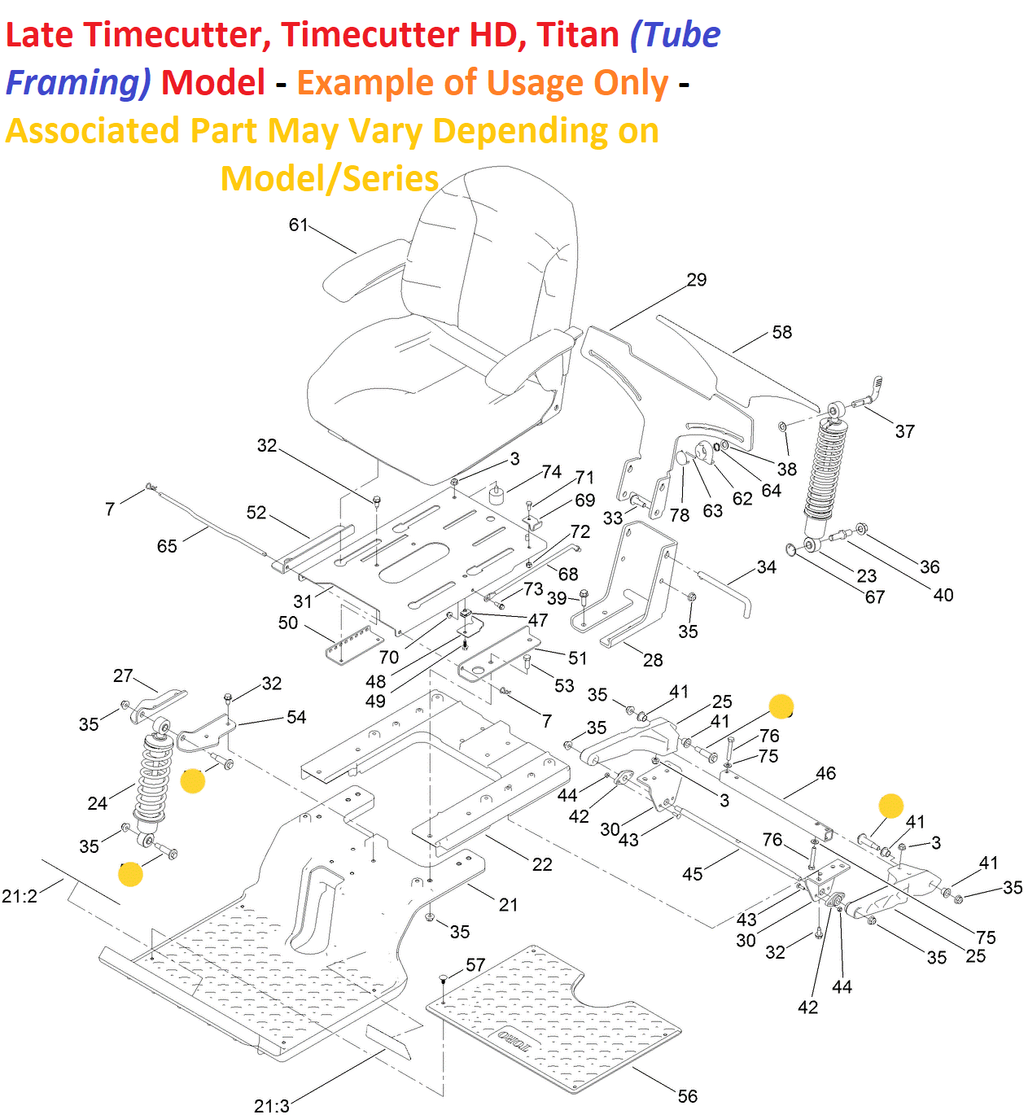 - Late Timecutter, Timecutter HD & Titan (Models with Tube Style Framing) My-Ride Models - Front My-Ride Shock/Spring Assembly and The My-Ride Trailing Arms Under the Seat.