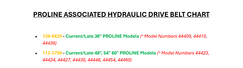NOTE 1: Due to Serial Number and/or Model Design changes it is always Beneficial to Eliminate Confusion by Searching your Belt Type and Model Number at the Top of our Website Page in the Search Tab. That in return will search the Model Fit Chart at the Bottom of the Page to Find the correct Model/Belt Part Number Combo. Second Method is to refer to the Images as well as refer to the Part Numbers under the PROLINE Hydraulic Drive Belt Associated Part Number Reference Chart and Visually Match the correct Part Number with the Correct Series/Model Combo. If this does not prove helpful and you still need assistance with finding the correct part number feel free to text us, email or give us a call and we can try to help you. Remember if further assistance is needed you will need to provide Models and Serial Number of the Unit you are wishing to receive Help with.