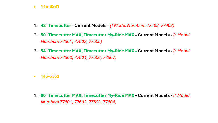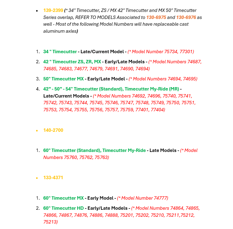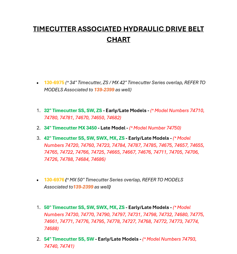 NOTE 1: Due to Serial Number and/or Model Design changes it is always Beneficial to Eliminate Confusion by Searching your Belt Type and Model Number at the Top of our Website Page in the Search Tab. That in return will search the Model Fit Chart at the Bottom of the Page to Find the correct Model/Belt Part Number Combo. Second Method is to refer to the Images as well as refer to the Part Numbers under the Timecutter Hydraulic Drive Belt Associated Part Number Reference Chart and Visually Match the correct Part Number with the Correct Series/Model Combo. If this does not prove helpful and you still need assistance with finding the correct part number feel free to text us, email or give us a call and we can try to help you. Remember if further assistance is needed you will need to provide Models and Serial Number of the Unit you are wishing to receive Help with.