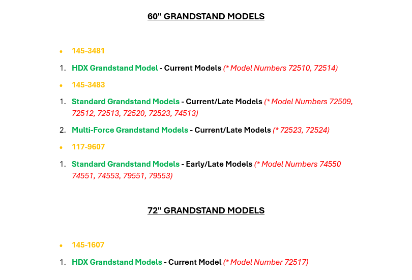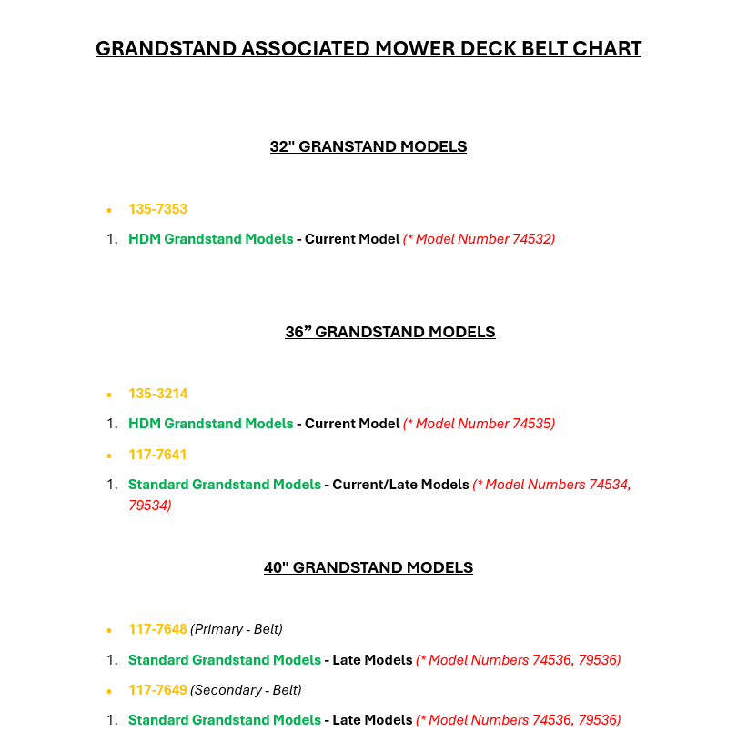 NOTE 1: Due to Serial Number and/or Model Design changes it is always Beneficial to Eliminate Confusion by Searching your Belt Type and Model Number at the Top of our Website Page in the Search Tab. That in return will search the Model Fit Chart at the Bottom of the Page to Find the correct Model/Belt Part Number Combo. Second Method is to refer to the Images as well as refer to the Part Numbers under the Grandstand Mower Deck Belt Associated Part Number Reference Chart and Visually Match the correct Part Number with the Correct Series/Model Combo. If this does not prove helpful and you still need assistance with finding the correct part number feel free to text us, email or give us a call and we can try to help you. Remember if further assistance is needed you will need to provide Models and Serial Number of the Unit you are wishing to receive Help with.