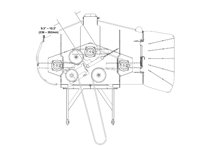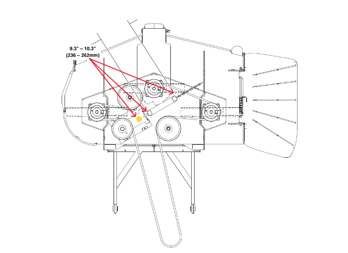 For Models with a Chain Tensioner Correct Mower Deck Belt Tension is Necessary. On Models with a 781302 Spring, Slide Tensioner and Chain - Hustler uses a **spring measurement from outside hook to outside hook** - Spring measurement from hook to hook should be 9.3 in. - 10.0 in. Review the Image Below for example of Measurement. (For Additional Spring Measurement Length Refer to manufacturer notes in Mower Deck Belt routing section of Service Manual).