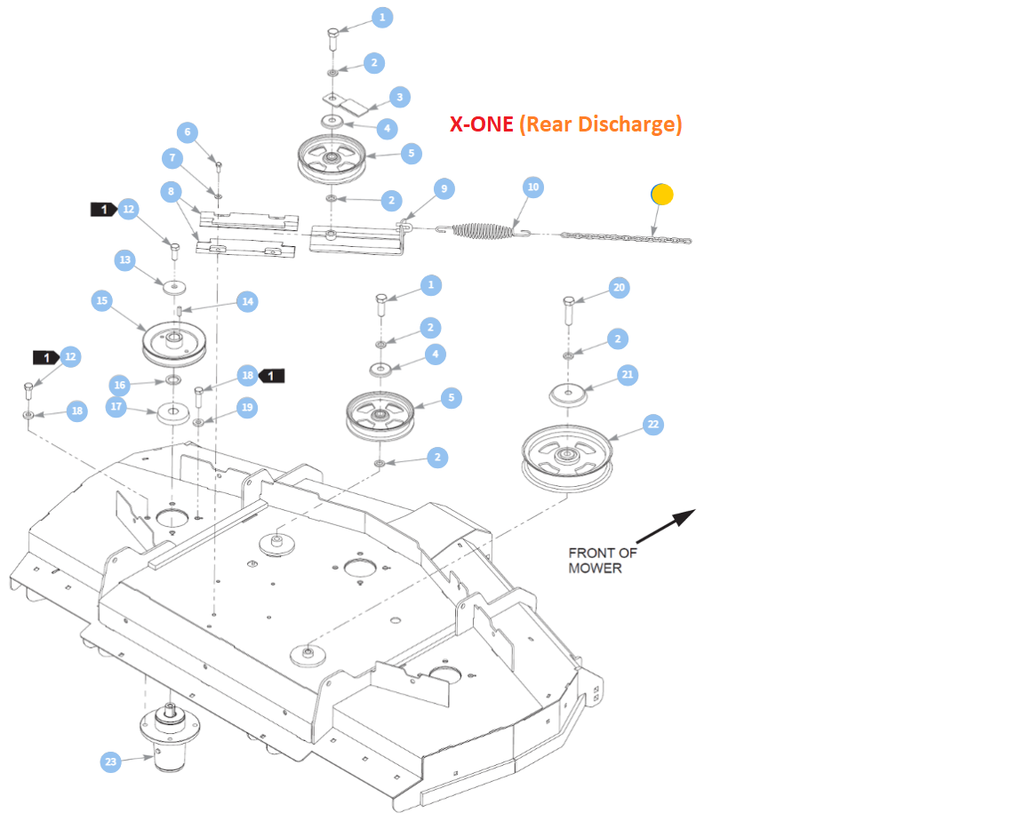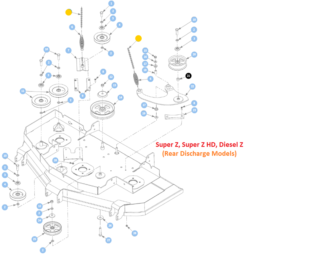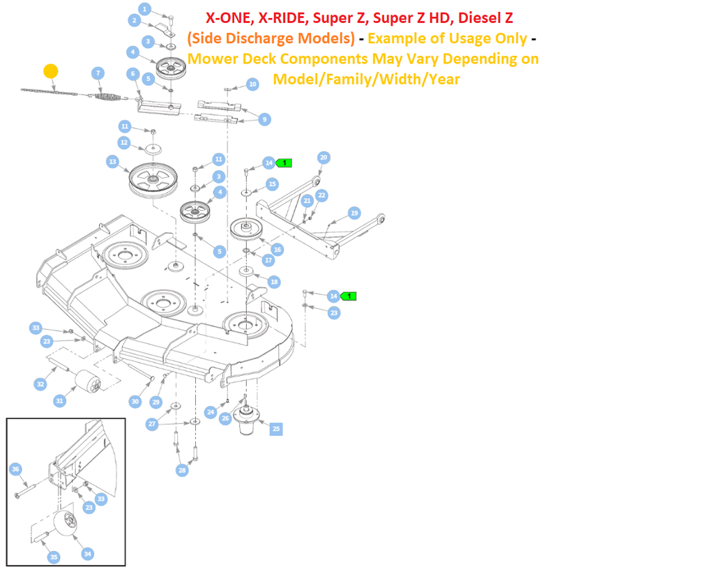 - 114105 - Mower Deck Idler Slide (Retains the Idler Pulley and Tensioner Spring and Insert into the Rail Slide or Wear Pads). * 2011 - Current X-ONE, Super Z, Super Z HD, Super ATZ, Diesel Z Rear Discharge Models