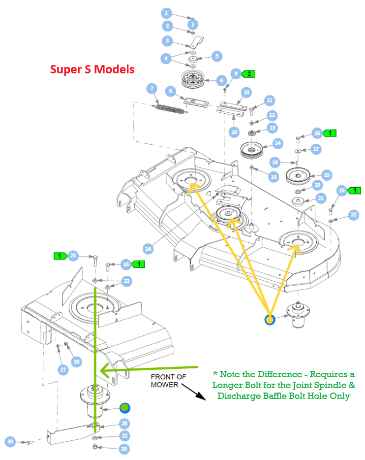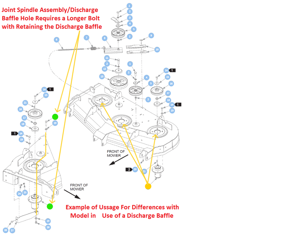 - 705954 - BOLT X 4 - Per Spindle Assembly - Assembled through the Mower Deck and then through the Spindle Assembly (1/2 X 1.25 - 13) * Select Models Only - Select Side Discharge Models that Contains a Discharge Baffle - Requires X3 705954 and X1 078949 Longer Bolt for the Joint Spindle Assembly & Discharge Baffle Hole Only on the Discharge Spindle - Marked in Image Above with a Green Dot.