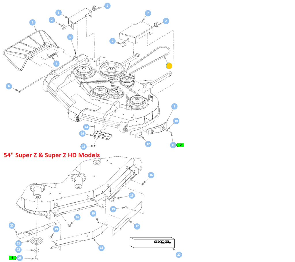Note: Super Z and Super Z HD 72" Rear Discharge Models Require Two Mower Deck Belts. The Primary Belt Travels from the Engine to the Mower Deck and Around Select Pulleys - Whereas the Secondary Mower Deck Belt is used only on the Mower Deck Itself between Mower Deck Pulleys.