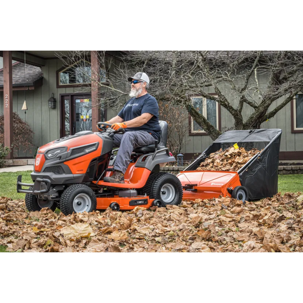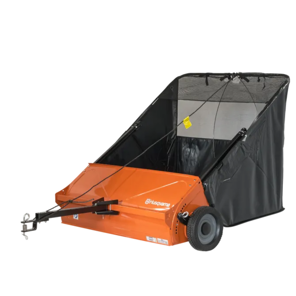 Enjoy efficient clean-up with this 42" sweeper. The 20 cu. ft. reinforced hopper with flow thru bag fills from top to bottom for greater collection, meaning you stop and empty less often. A clean sweep with just one pass with 5:1 Brush to Wheel Ratio. Positive lock height adjustment will not vibrate out of position and has easy to remember height settings. 12” polypropylene brushes; 12" x 2.5" semi-pneumatic tires. Extra wide 9 in. chute prevents clogging. Collapsible hitch, hitch arms, and bag for compact storage. 3-position hitch adjustment allows use with all Husqvarna lawn and garden tractors. Nylon brush axle shaft for less wear (vs. plastic bushing). Dumps from tractor seat for easy composting. Fits all Husqvarna tractors. Fits Husqvarna residential zero-turns with accessory hitch kit.