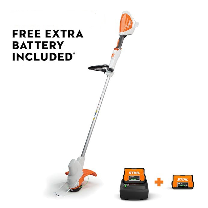 Get great value with the STIHL® FSA 57 lithium-ion trimmer. A lightweight, battery-powered trimmer, the FSA 57 is an ideal choice for maintaining suburban yards. This trimmer cuts an 11" swath at a continuous high speed, saving time and doing more with a STIHL® AK System battery. With an AK 10 battery, this trimmer weighs less than eight pounds and has a run time of up to 25 minutes* On A Single Charge™. For comfort and convenience, this unit features an adjustable shaft to customize height, an easy-to-use AutoCut® head which feeds noise-reducing line, and a bump guard to help trim carefully around obstacles like trees and shrubs. The FSA 57 trimmer is available as a stand-alone unit or as a value-priced set with the AK 10 battery and AL 101 battery charger. Other battery options are available.